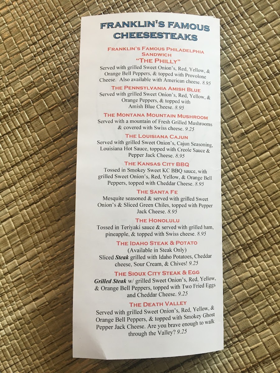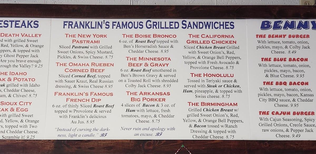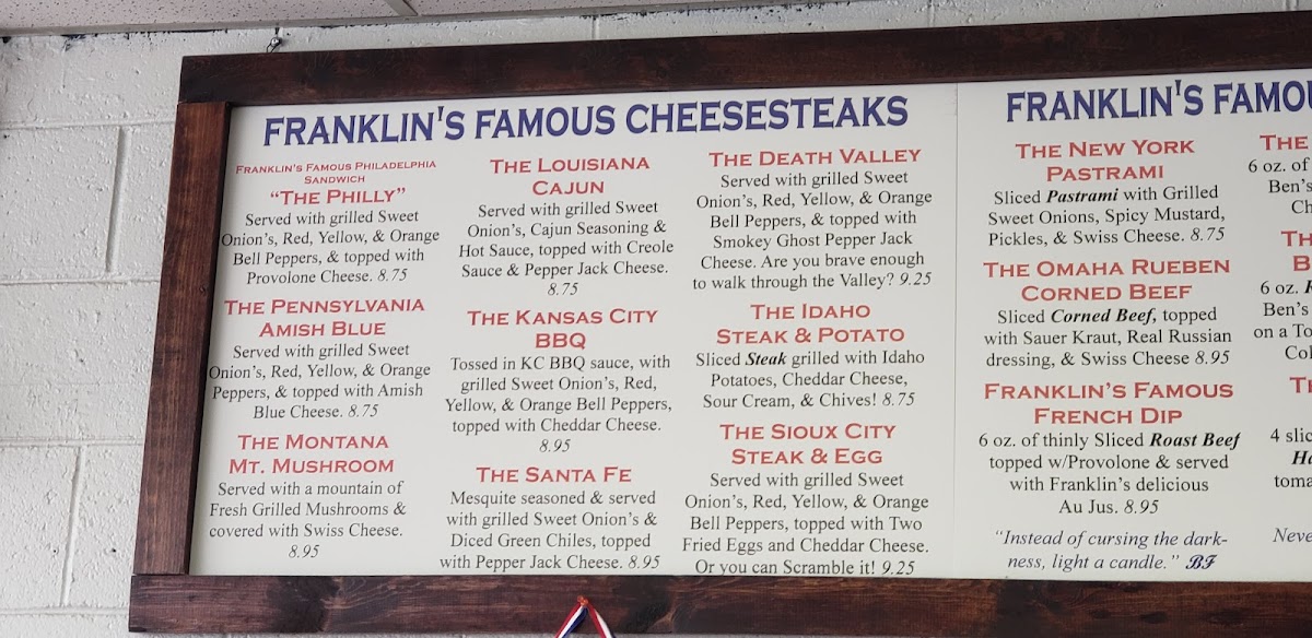Welcome to Franklin's Famous Cheesesteak Company, nestled in Idaho Falls, where flavor meets tradition! Their standout menu features a variety of cheesesteaks that will transport your taste buds straight to Philadelphia. The signature "The Philly" boasts grilled sweet onions and vibrant bell peppers, all enveloped in melty provolone cheese for just $11.95. For something unique, try "The Pennsylvania Amish Blue" topped with Amish blue cheese, or indulge in "The Montana Mountain Mushroom" for a hearty twist.
